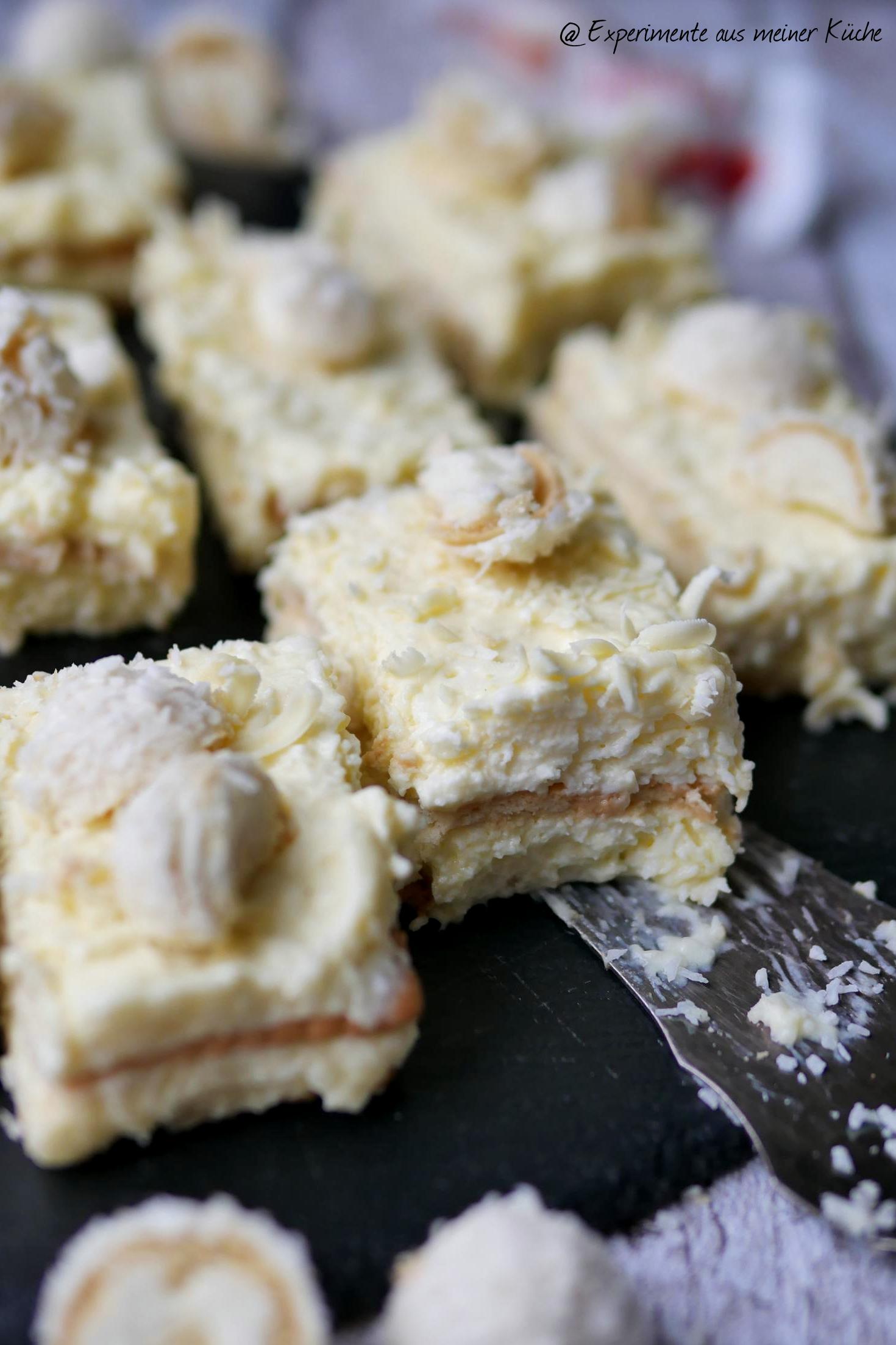 - 200g Butterkekse auf einem Blech oder in einem Backrahmen auslegen. Die halbe Creme darauf verstreichen und mit den restlichen Butterkeksen bedecken. Creme darauf verstreichen. Für die Deko Kokosraspel etwas anrösten und abkühlen lassen.