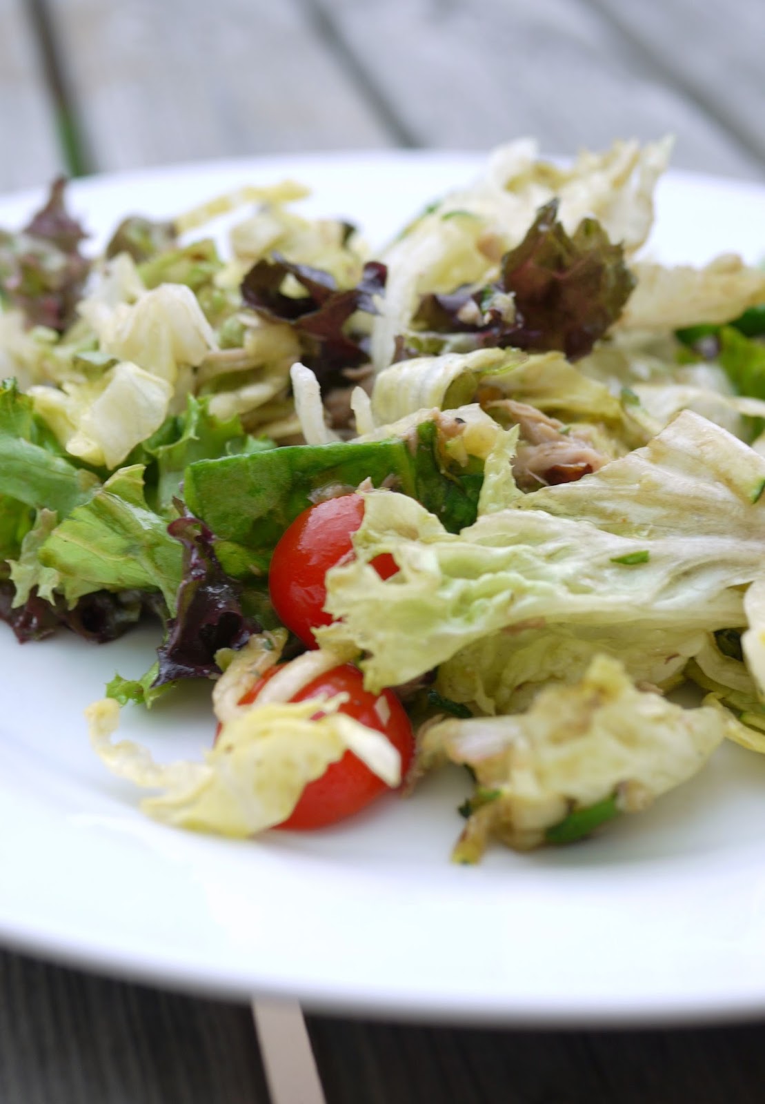 Salz, PfefferSalat, Thunfisch, Kirschtomaten und Zucchini-Füllung in einer Schüssel mischen. Dressing anrühren und zu dem Salat geben. Sofort servieren.