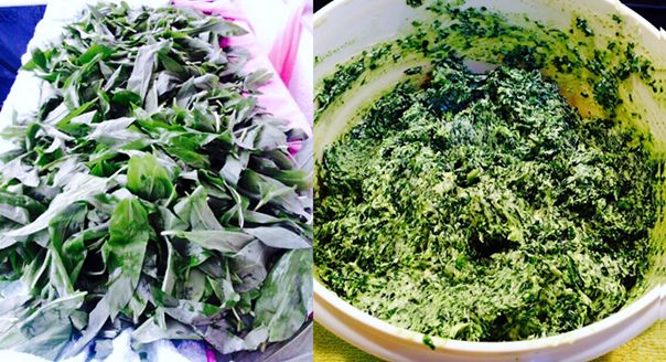 Während der Teig vor sich hin schlummert und aufgeht, wird aus dem frischen Bärlauch eine Bärlauchbutter hergestellt. Dafür den Bärlauch waschen, trocknen und klein hacken/schneiden. Da ich ein großer Fan von Knoblauch bin, schneide ich immer noch zwei Knoblauchzehen klein. Beides zusammen wird mit der restlichen Butter verrührt und etwas gesalzen.