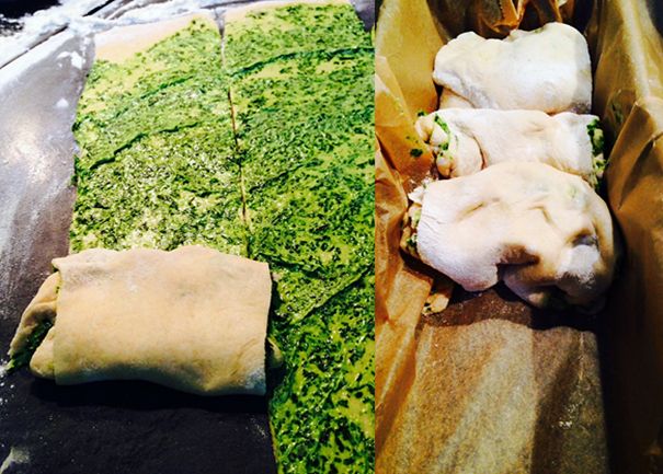 Beim Ausrollen darauf achten, dass der Teig ungefähr ein Rechteck ergibt, welches anschließend gleichmäßig mit der Bärlauchbutter bestrichen wird. Den Teig in 5 gleichgroße Teile schneiden und locker zusammenfalten oder grob zusammenrollen. Die einzelnen Teigstreifen werden aneinander in einer mit Backpapier ausgelegten Kastenform gestellt.