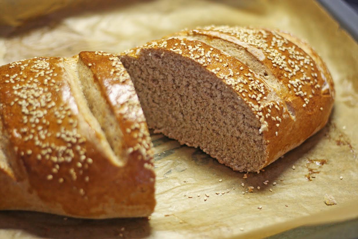 abgedeckt ca. 30 Minuten gehen lassen. Nun das Eigelb mit 1 EL kaltem Wasser verquirlen, das gegangene Brot damit bestreichen und im vorgeheizten Ofen bei 200°C Ober-/Unterhitze für 10 Minuten backen. Dann nochmals mit Ei bestreichen, Sesam darüber streuen und weitere 15-20 Minuten backen. Das Brot eventuell nach 10 Minuten abdecken damit es