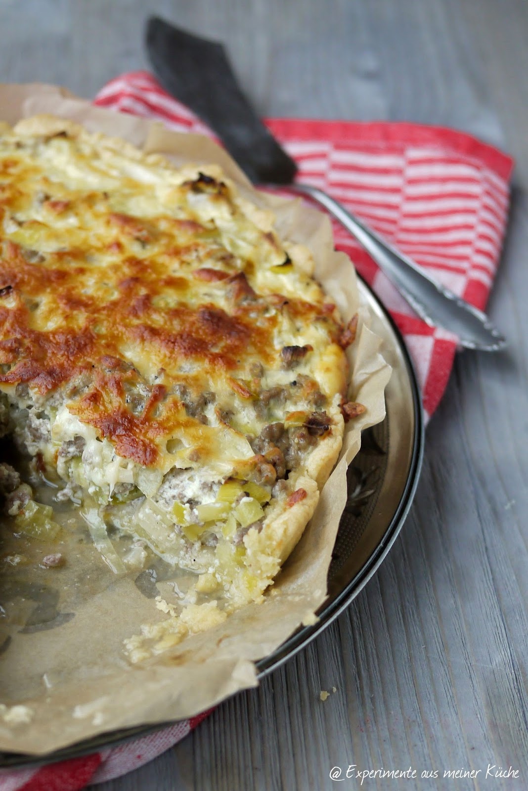 Spargel-Quiche versucht, die an sich zwar ganz lecker war, aber leider total versalzen 🙁 Seitdem habe ich einen großen Bogen um dieses herzhafte Gericht gemacht! Bis jetzt! Schließlich wollte ich auch diesen Monat wieder meinen Beitrag „abliefern“. Anstatt Blätterteig wie beim letzten Mal, hab ich mich jetzt an einem Mürbeteig und einer Hackfleisch-Lauch-Füllung versucht, bin sparsam mit Salz umgegangen und siehe da, es hat ganz wunderbar geschmeckt 😉