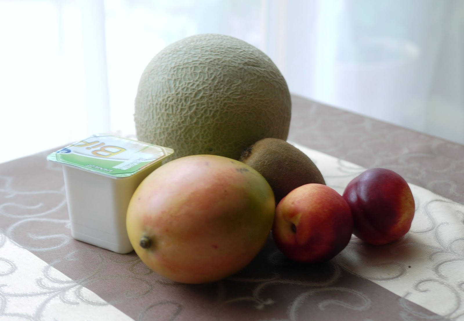 Mango, Kiwi und Melone schälen, Nektarinen waschen und alles in Stücke schneiden. Obst zusammen mit