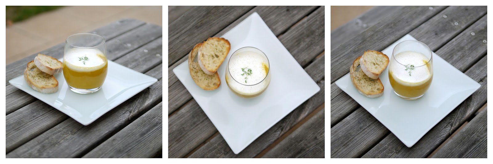 Suppe auf Tellern, Schalen oder sogar im Glas anrichten, Ingwer-Schaum darauf verteilen und die Crostini dazu reichen und den Herbst willkommen heißen 🙂