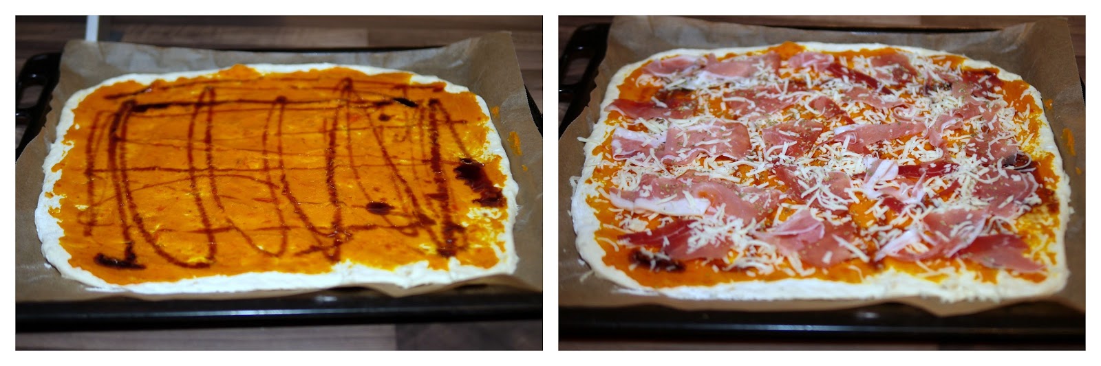 belegten Blech ausrollen und mit dem Kürbispüree bestreichen. 2 –
