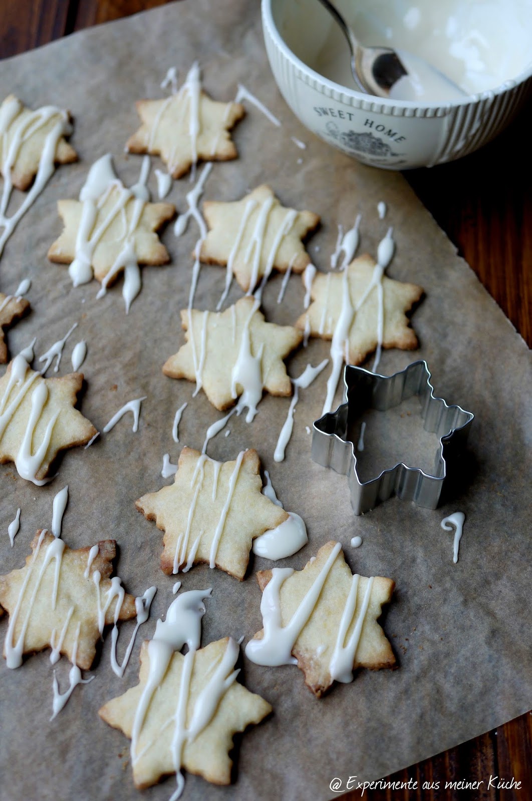 - Die ausgekühlten Plätzchen können dann mit der Puderzuckerglasur verziert werden. Dafür den Puderzucker sieben und mit Orangensaft und Bittermandelaroma zu einem Guss verrühren. Entweder mit einem Pinsel auf die gesamten Fläche streichen oder mit einem Löffel streifenförmig über den Sternen verteilen.