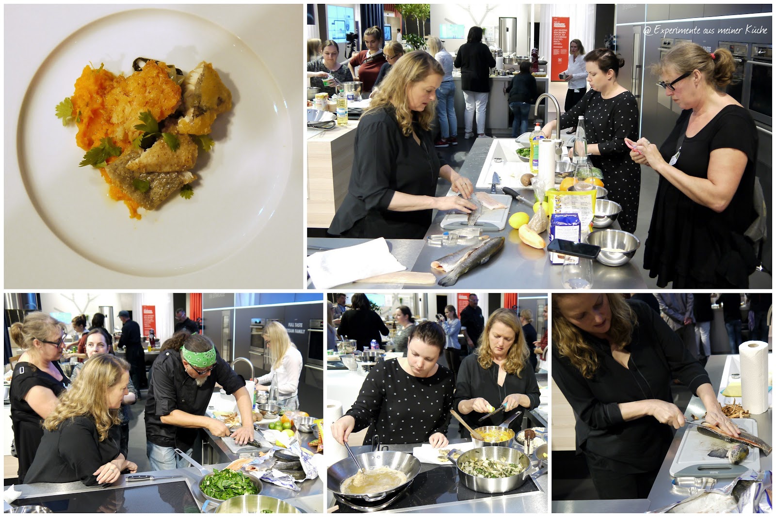 Simone, Annette und Petra haben die „Forelle Müllerin“ neu interpretiert und den Fisch mit drei unterschiedlichen Panaden und Süßkartoffelpüree serviert: