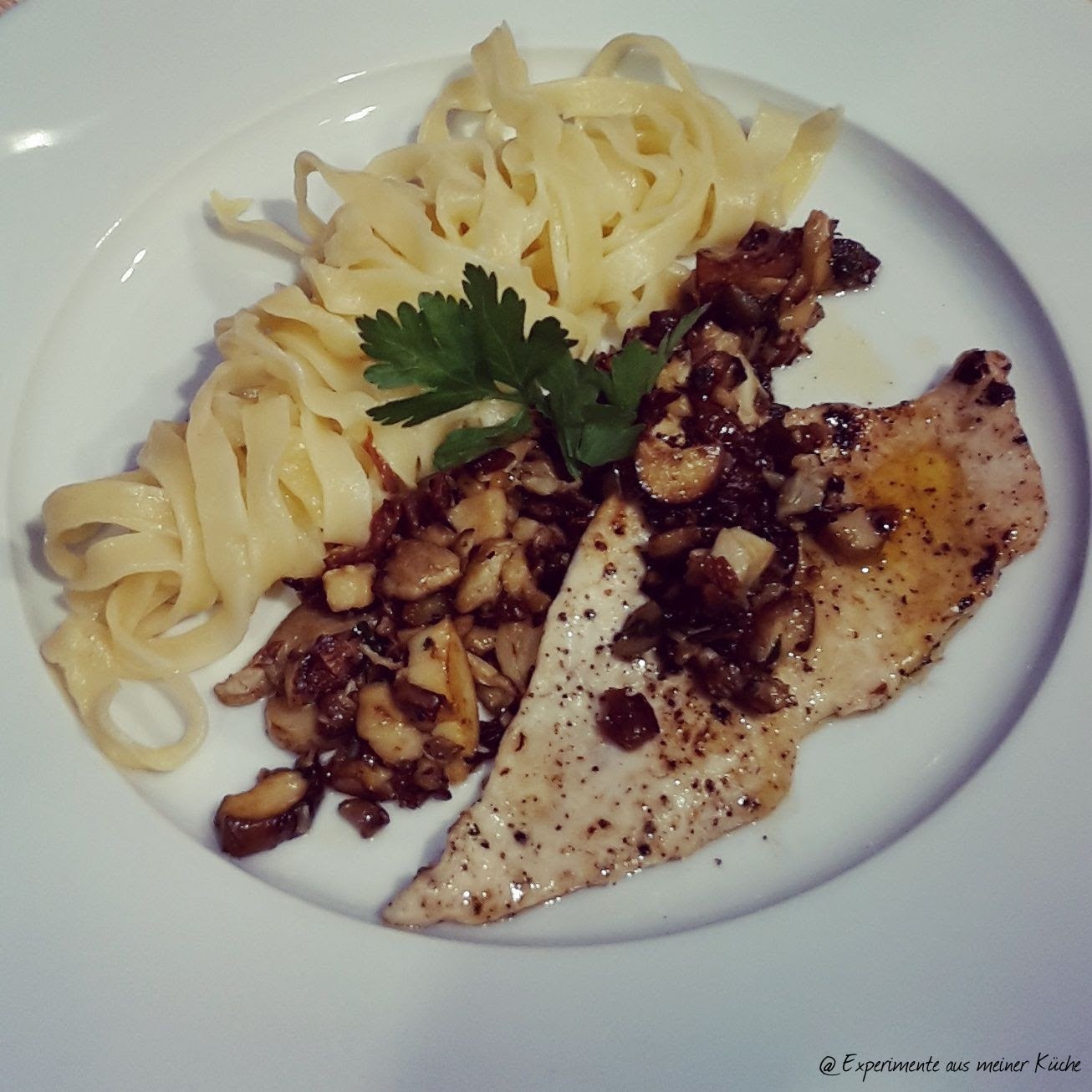 Servieren wieder rausgeholt. Ordentlich Butter in der Pfanne schmelzen und die Pilze hineingeben. Jetzt nicht umrühren, sondern 2 – 3 Minuten von einer Seite anrösten. Danach durchrühren und ggf. noch Butter dazugeben. Zum Schluß noch die getrockneten Tomaten, die Flüssigkeit der Kapern und etwas Petersilie unterheben und warmhalten. Für das Fleisch Öl in einer zweiten Pfanne erhitzen und die Schnitzel von jeder Seite kurz braun anbraten. Zusammen mit den Pilzen anrichten. Ein Jägerschnitzel, was selbst mir unglaublich gut geschmeckt hat, obwohl ich eigentlich gar keine Pilze mag 😉