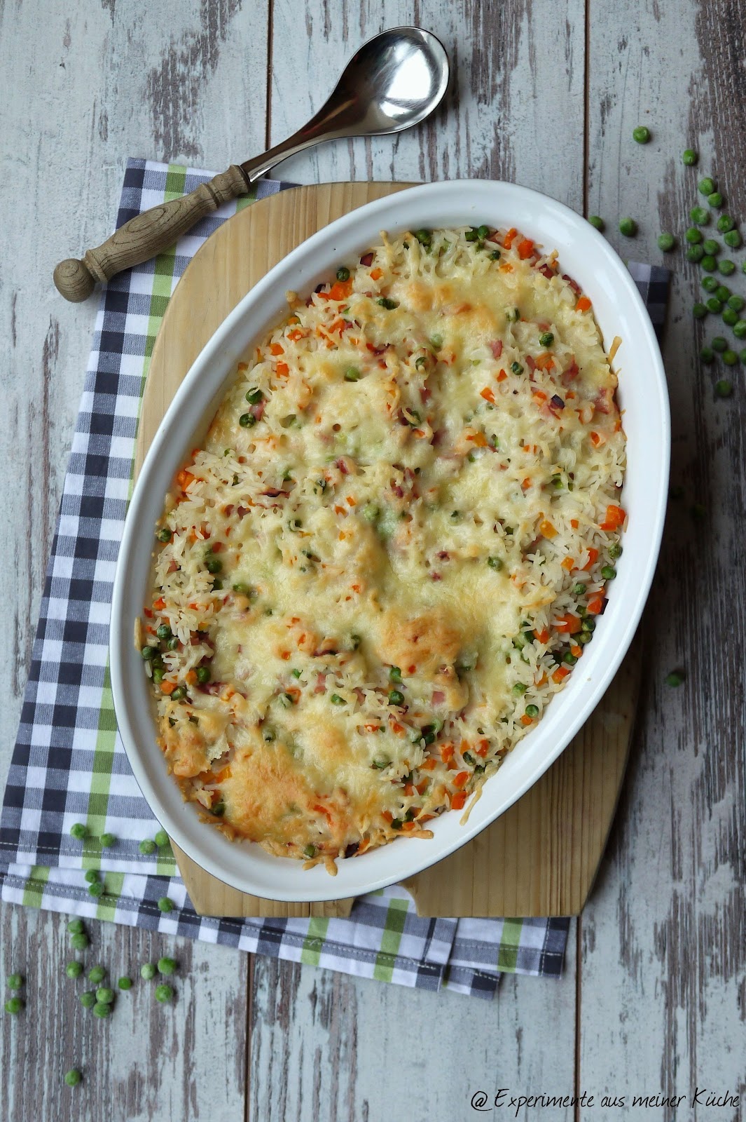 Risi Bisi – auch Risi Pisi oder Risi e Bisi genannt – ist eigentlich ein Erbsenrisotto mit Risotto-Reis, Pancetta und Parmesan. Ich habe das Gericht zu einem Auflauf abgewandelt und verwende Langkornreis, Kochschinken und zusätzlich noch Möhren. Eier, Milch und Käse geben dem Auflauf Geschmack und halten ihn zusammen.