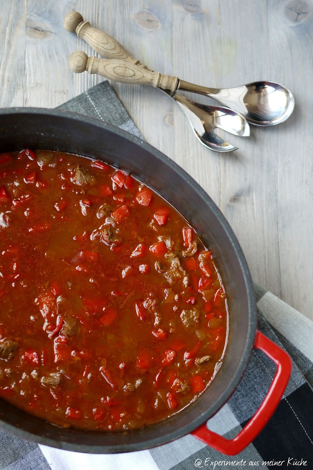 Wie ihr sicherlich wisst (bzw. an meiner Rezeptauswahl merkt) gibt es bei mir zu Hause – außer in Form von Hackfleisch – eher selten Rind- oder Schweinefleisch. Es ist nicht so, dass ich es nicht mag, aber irgendwie bevorzuge ich doch lieber Hähnchen oder Pute. Vielleicht weil es einfach schneller geht 🙂 Aber da Schatzi sich nun schon mehrfach ein „richtig ordentliches“ Fleischgericht gewünscht hat, bin ich mal über meinen Schatten gesprungen und habe Gulasch gekocht 😉
