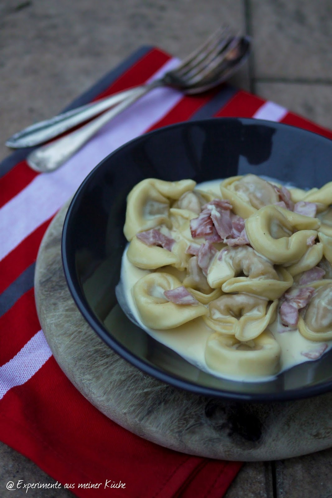 Ich glaub Tortellini in Schinken-Sahnesauce waren so ziemlich das erste Gericht, dass ich als Kind so ganz alleine selbst gekocht hatte. Damals bestand meine Sauce allerdings aus in Sahne aufgelöstem Scheiblettenkäse. *grusel*