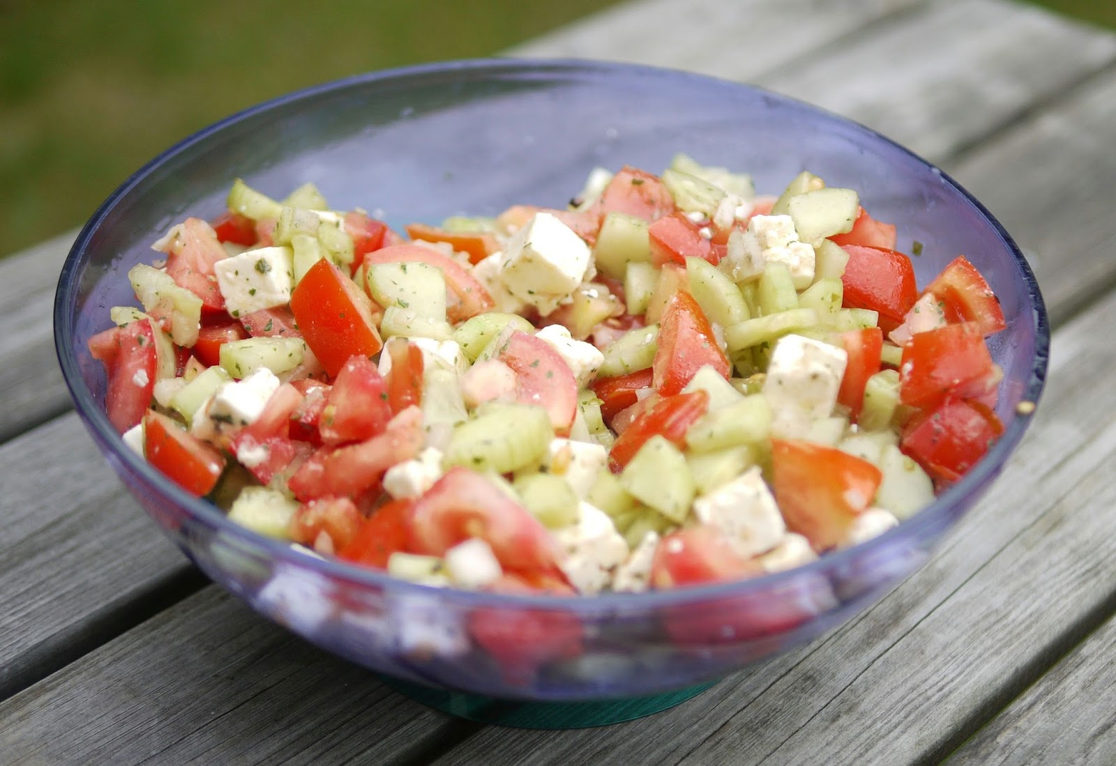 Gurke schälen, Tomate waschen und alles in Würfel schneiden. Zwiebel schälen und klein schneiden. Alles in einer Schüssel zusammen mit dem Fetakäse mischen. Aus Olivenöl, Balsamico, Kräutern, Zucker, Salz und Pfeffer ein Dressing zubereiten und mit den restlichen Zutaten vermengen. 5 Minuten ziehen lassen. Diese Portion reicht als Beilage für 4 – 5 Personen.
