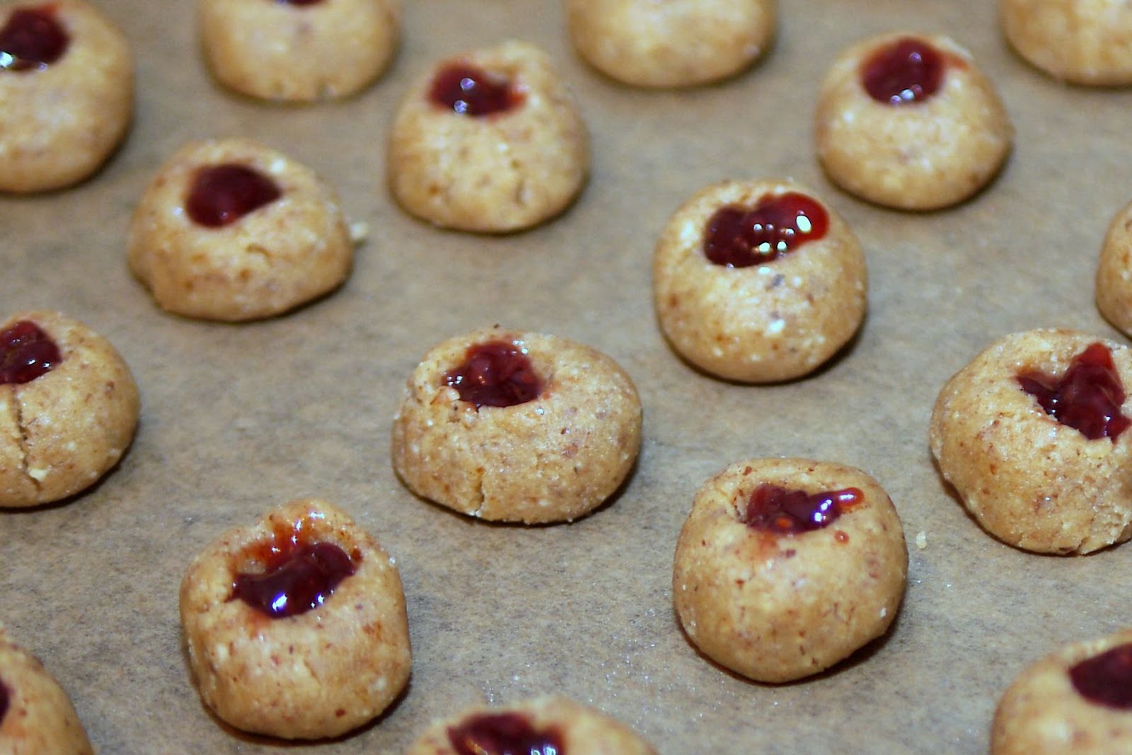 Zimt dazugeben und alles zu einem glatten Teig verkneten. Eine halbe Stunde im Kühlschrank kalt stellen. Aus dem Teig 60 kleine Kugeln formen und auf ein mit Backpapier belegtes Blech setzen. Mit einem Stäbchen eine Vertiefung hinein drücken und mit Marmelade füllen.