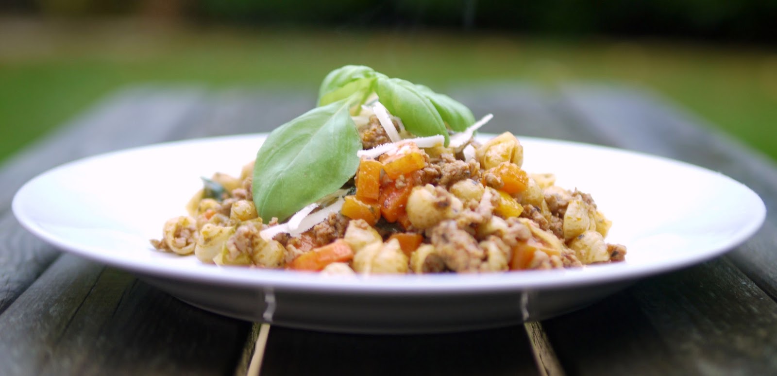 In der Zwischenzeit die Nudeln nach Packungsanleitung kochen. Sobald die Nudeln fertig sind, abgießen und zu der Hackfleisch-Pfanne zufügen. Bei Bedarf noch mit 1 EL italienischen Kräutern, 1 EL Oregano und Salz abschmecken. Zum Schluss die frischen Basilikumblätter hacken und unterrühren. Mit Parmesan servieren.